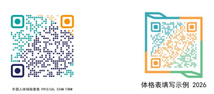 5.外国人体格检查表(见附件1 或扫描二维码下载)。申请人应严格按照《外国人体格检查表》的填写示范(见附件2 或扫描二维码下载)逐项检查,填写语言为中文或英文二选一。缺项、首页未贴本人照片或照片上未盖章、无医师签字和医院盖章、无检查日期、姓名与护照全名不一致的检查表一律无效。检查时间必须为 2026 年 2 月 20 日后。如被录取,须携带《外国人体格检查表》原件到校报到。