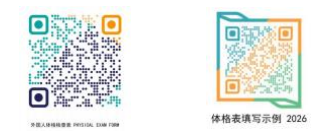 5.外国人体格检查表(见附件2或扫描二维码下载)。申请人应严格按照《外国人体格检查表》的填写示范(见附件3或扫描二维码下载)逐项检查,填写语言为中文或英文二选一。缺项、首页未贴本人照片或照片上未盖章、无医师签字和医院盖章、无检查日期、姓名与护照全名不一致的检查表一律无效。检查时间必须为 2026年2月20日后。如被录取,须携带《外国人体格检查表》原件到校报到。
