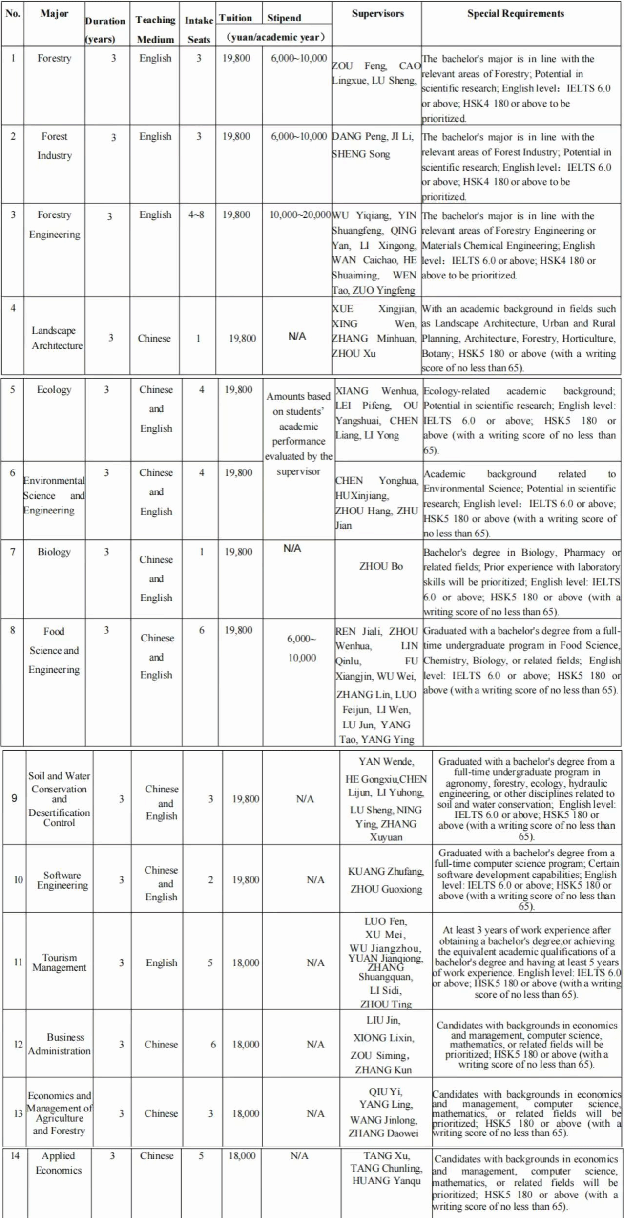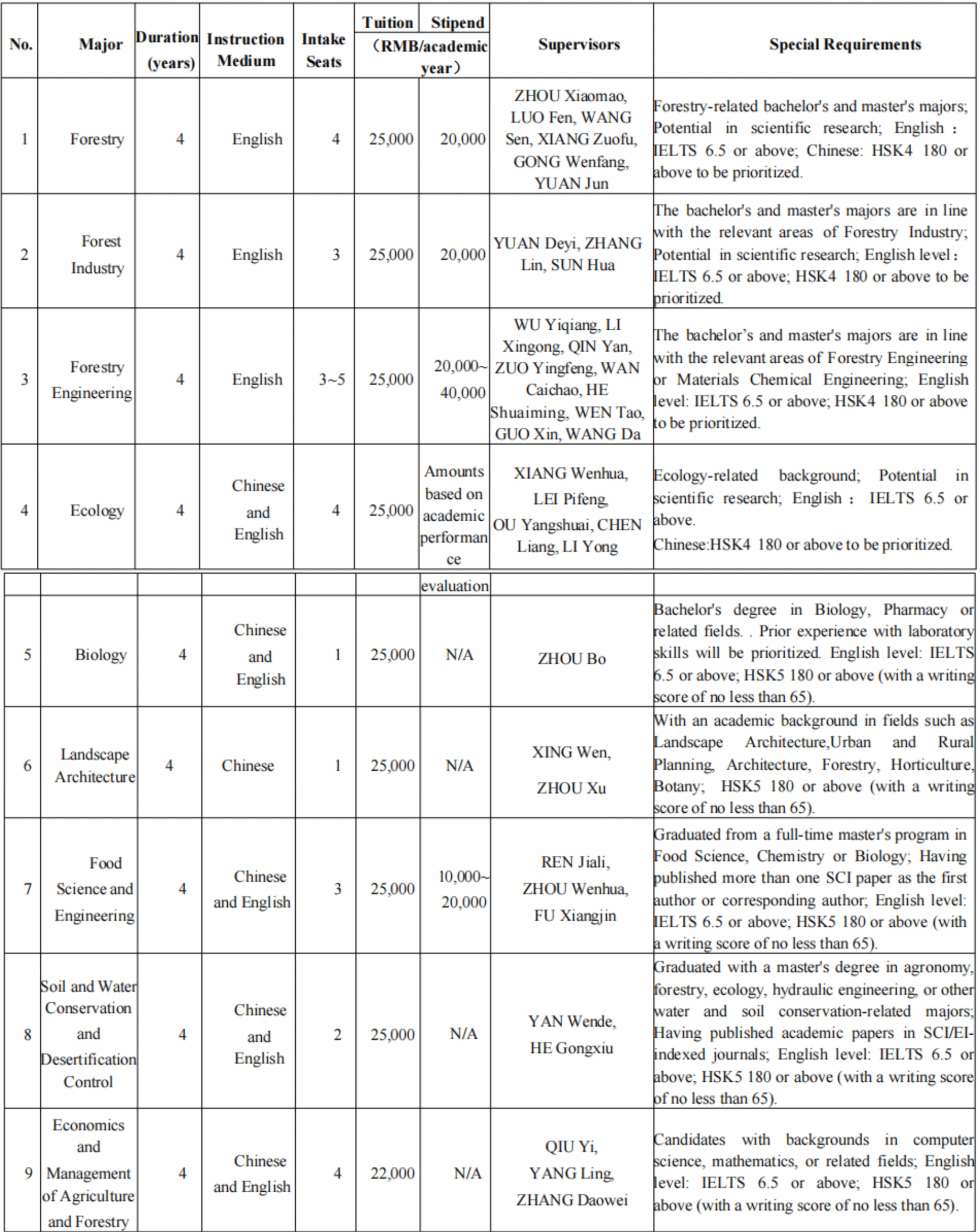 1. Applicants should be non-Chinese high school graduates with no criminal record, physical and mental health, excellent academic grades, strong academic background, and scientific research and innovation ability; for international students with education experience in China do not belong to the “Three-illegal” persons (illegal entry, illegal residence, illegal employment) or have been punished by the school due to serious disciplinary and regulatory violations, and voluntarily abide by the laws of China and the regulations of CSUFT. Applicants concealing the disciplinary violations will be held responsible for the consequences.