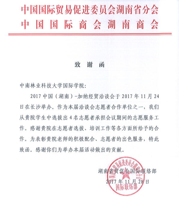 我院4名学生志愿者廖诗豪、余景慧、刘梓聪、莫丽莎在此次经贸洽谈会期间,参与会务筹备、展馆布置、现场咨询等服务工作;积极配合组委会工作,为来宾进行疑难解答并维持现场秩序。志愿者们热情周到的服务得到了会议举办方和参会各界人士的一致好评。湖南贸促会还为此特意发来致谢函。