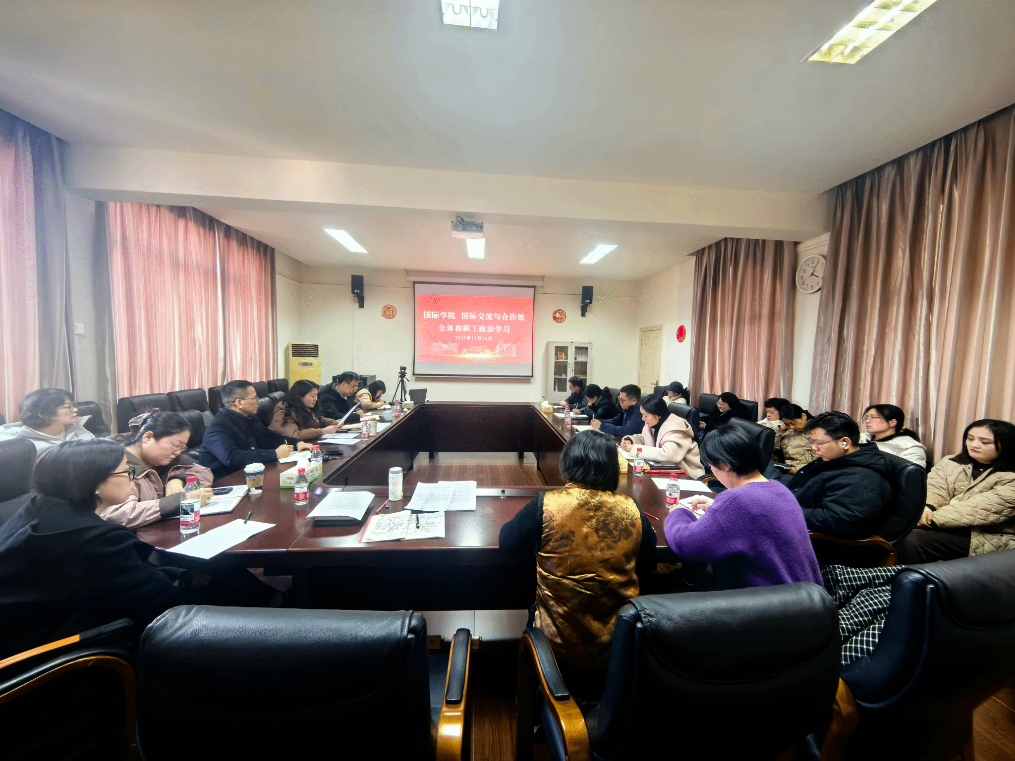 为深入学习贯彻党的创新理论,筑牢教职工思想根基,凝聚国际化办学奋进力量,12 月 26 日,国际学院在致远楼 603 会议室组织全体教职工开展专题政治学习。学院党总支书记、院长谭丹主持学习并领学授课。