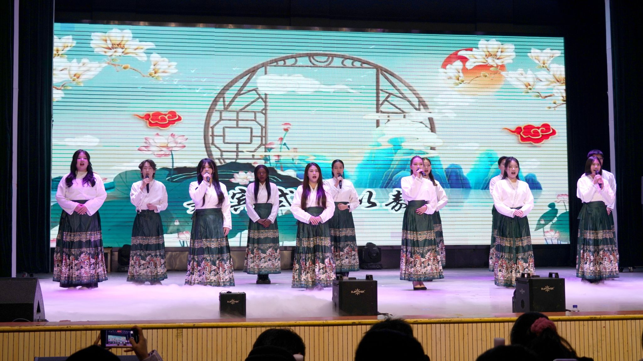 晚会节目由两院学子联袂献艺,融合中外风情,共绘青春画卷。班戈学院学生以活力四射的现代舞与深情婉转的歌曲串烧点燃现场,展现出扎实的舞台表现力与昂扬的精神风貌。我院留学生则通过热烈奔放的《新春热舞·同心筑梦》、华彩动人的传统服饰展示《华服遇世·青春绽华》,传递出浓郁的多民族文化特色。来自非洲的“李白”激昂吟诵《将进酒·须尽欢》,多国学子共同演绎的《诗经·小雅·鹿鸣》让古典诗韵在交融中和鸣,将晚会推向情感与文化的共鸣高潮。