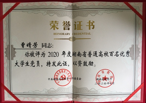 近日,省委教育工委发文《关于表彰湖南省普通高校百佳大学生党员的通报》,决定授予全省各高校100名学生“湖南省普通高校百佳大学生党员”荣誉称号。我院曾婧芳同学获此殊荣。曾婧芳同学严格以党员标准要求自己,深入学习习近平新时代中国特色社会主义理论,思想品德优良,有真才实学,综合素质较高,是广大学生和学生党员学习的榜样。(刘老师供稿,李志审核)