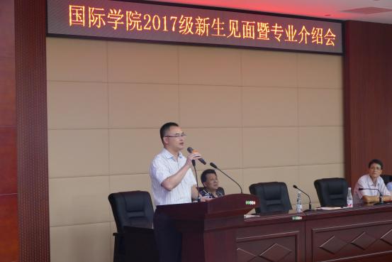 邓天文在新生见面会上代表学院致辞,他首先对2017级新生表示热烈的欢迎,并用特别的方式定义了国际学院学生的特质和风貌,接着简单介绍了国际学院光荣的历史、规范的国际教育、优秀的师资和辉煌的成绩,鼓励同学们把住时代的脉博,多体验,多思考;多实践,多交流;自信,自尊,用自己的方式把名字镌刻在国际学院的优秀校友录中,在“大国崛起”的时代自豪地青春不悔。