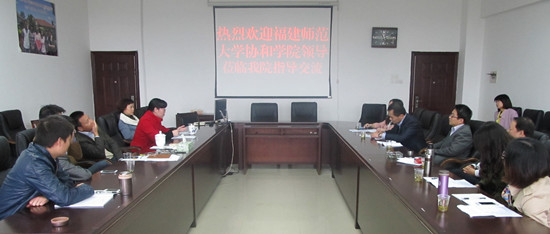 2014年11月28日,福建师范大学协和学院常务副书记黄跃鹏、副院长王进安等一行6人来访我院,对我院进行了实地考察和工作经验交流。我院院长王志文、党总书记李志、副书记陈幸福、副院长张敬、潘四群及部门负责人参加了座谈。