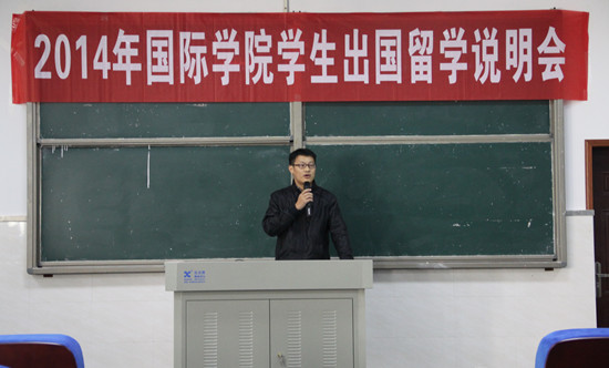 13日上午,2014年国际学院学生出国留学说明会在国际楼一楼报告厅举行。学校校长助理、国际合作与交流处处长、班戈学院院长阳志清,国际学院王院长志文,国际合作与交流处副处长范群,学校合作中介代表以及学院有意出国的广大同学出席了说明会。会议由国际学院项目办公室负责人熊良文老师主持,说明会分三个阶段进行,分别是:学校出国留学政策及流程介绍;留学中介项目推介;现场咨询。